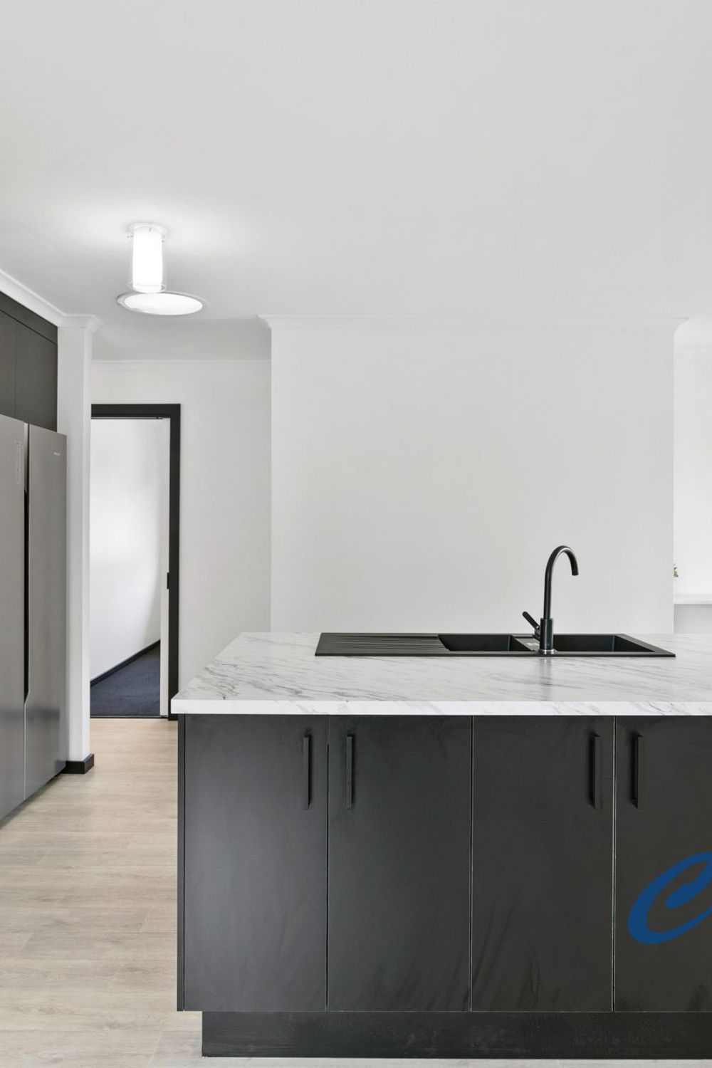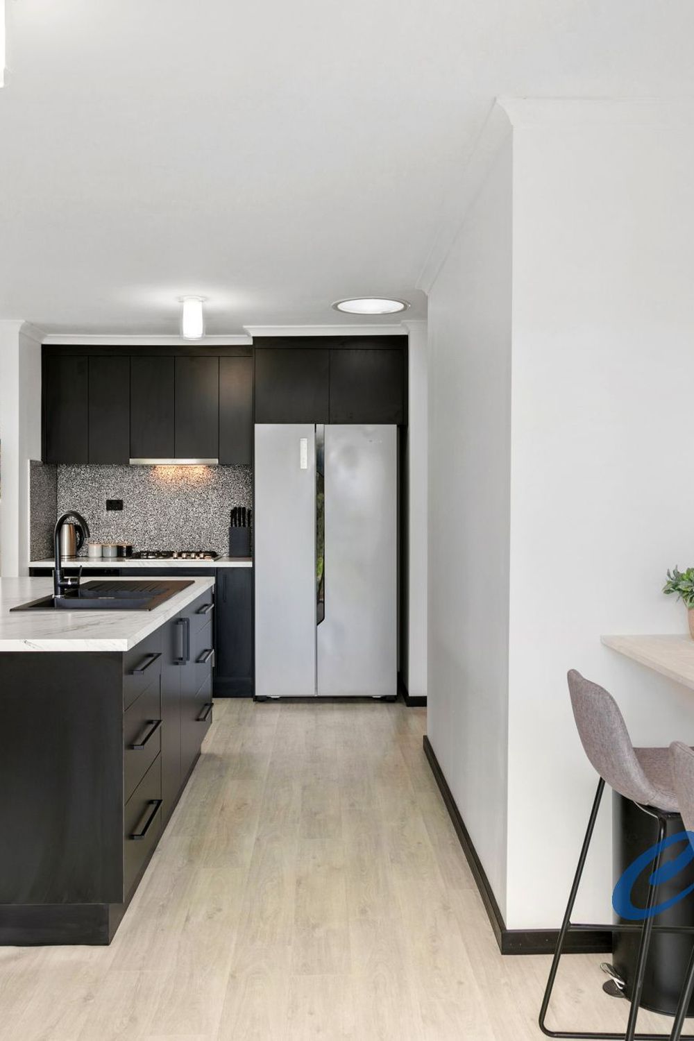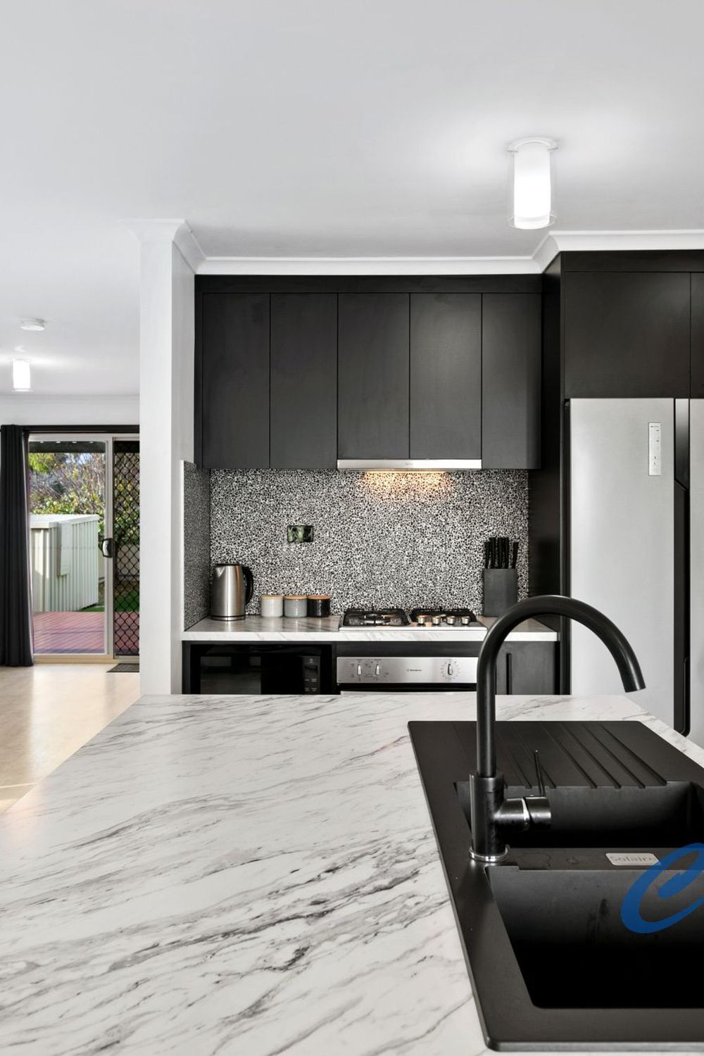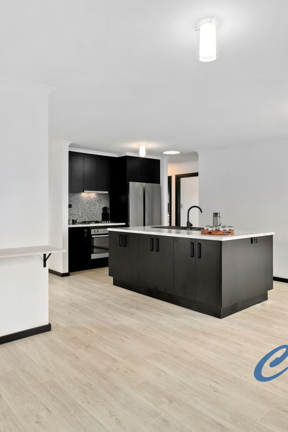 The kitchen has a generous island bench with premium black tapware and a separate cooking nook with gas stove and electric oven. The kitchen is complimented with a separate breakfast bar.