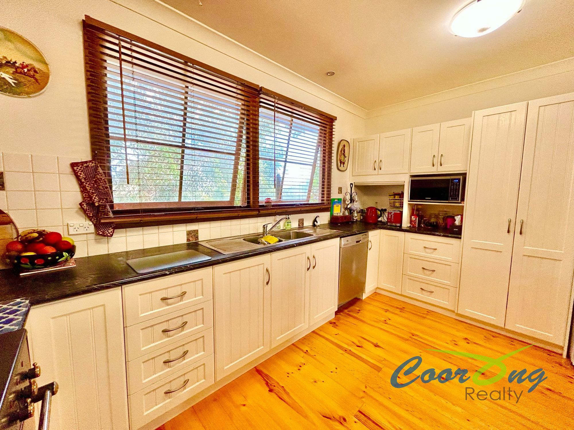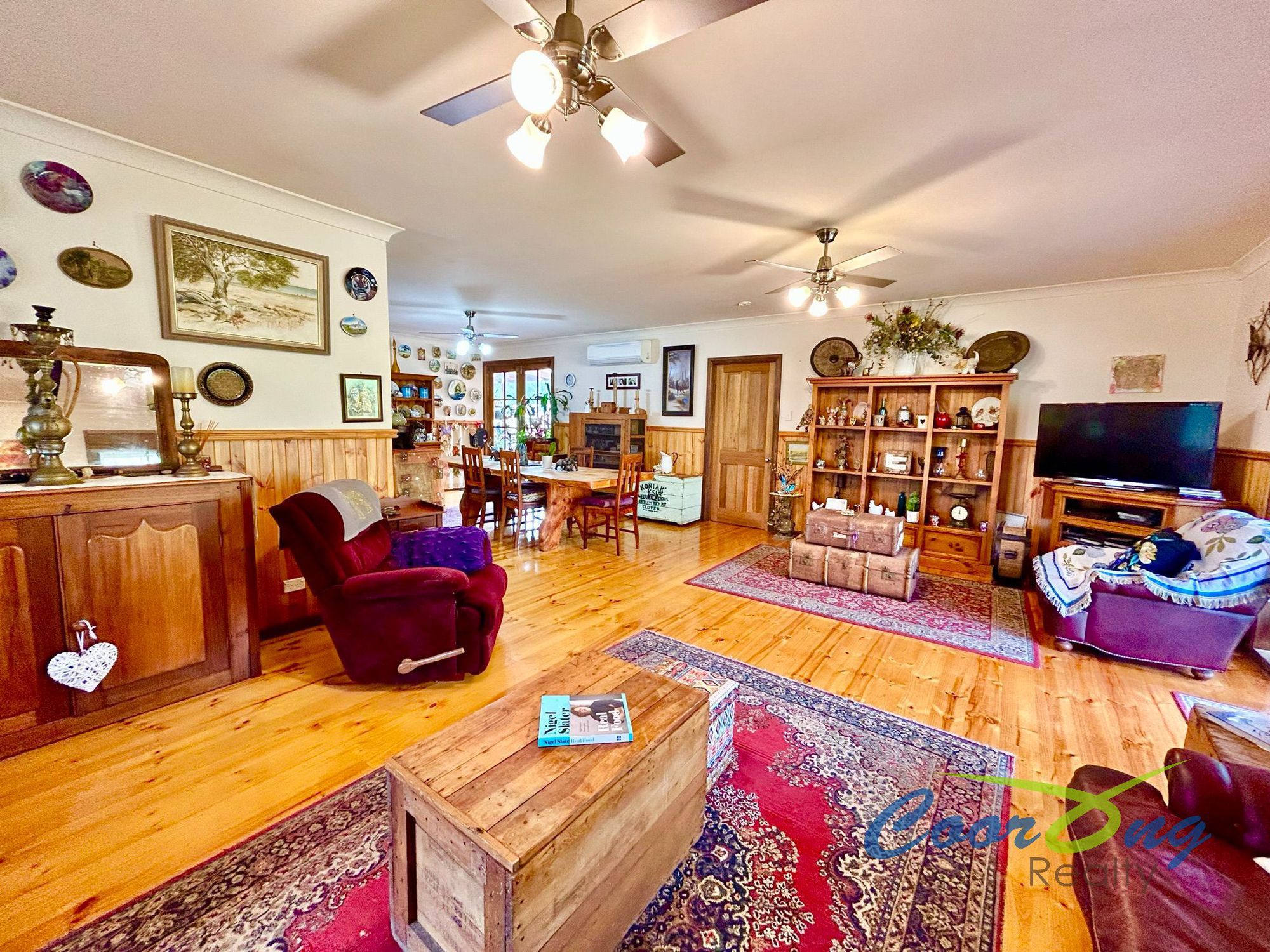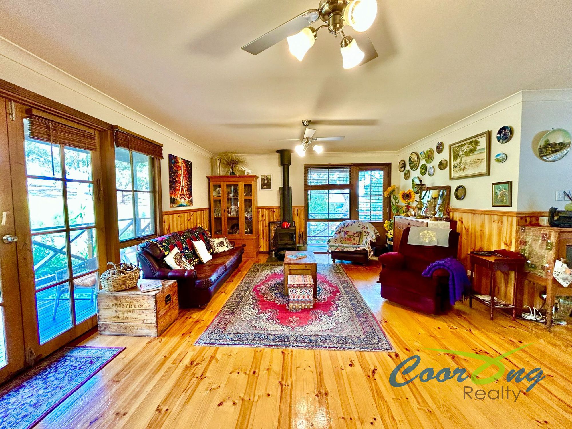 The living area contains a reverse cycle air conditioner and slow combustion fire with ceiling fans. It’s of generous size and has a country feel with the wood panel wainscoting. Light and airy throughout with numerous French doors, timber window frames and polished timber floorboards throughout.