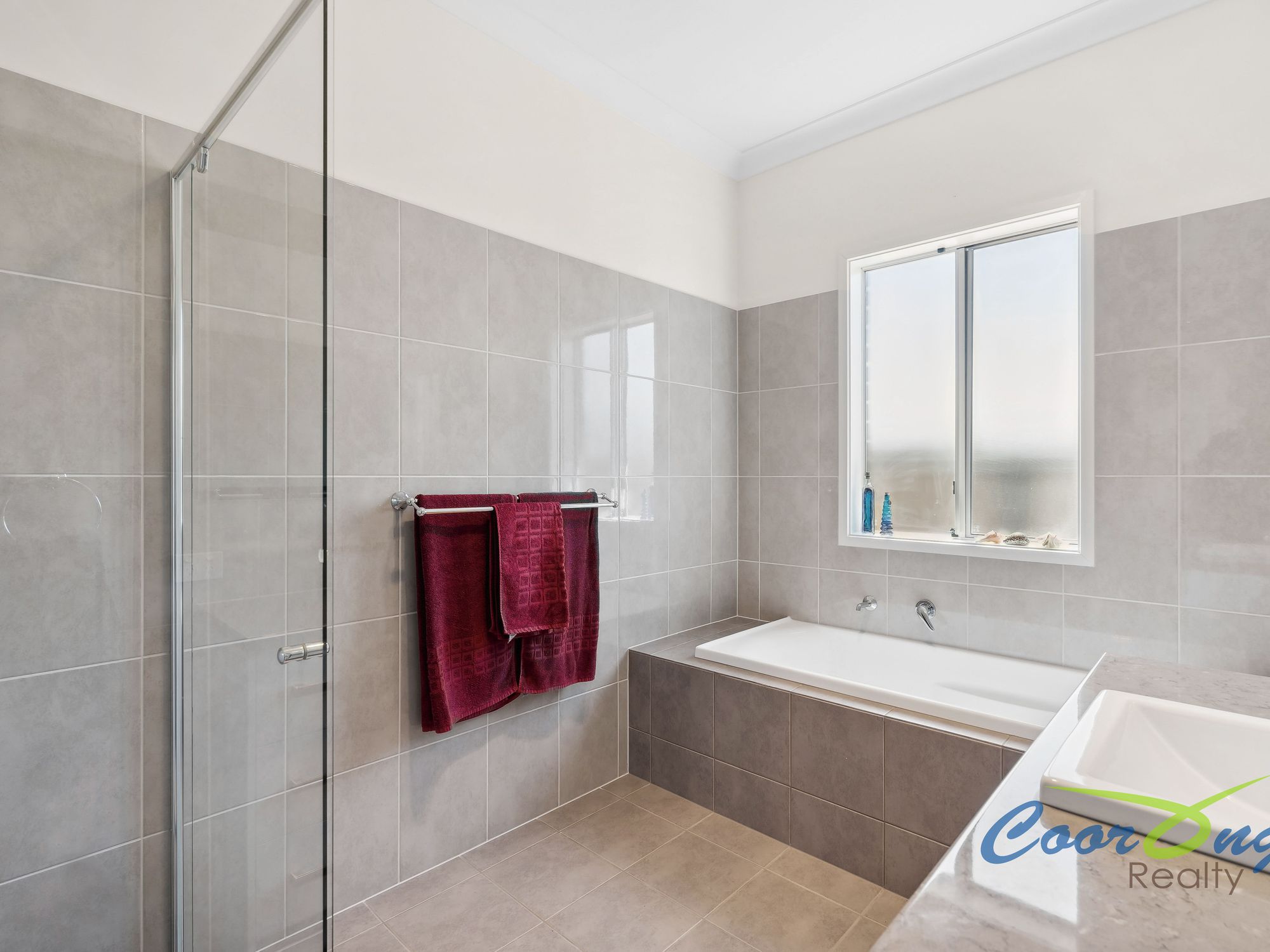 The main bathroom has high wall tiles, a walk-in shower, bath, and vanity, while there is also a separate powder room with vanity and toilet for guests.