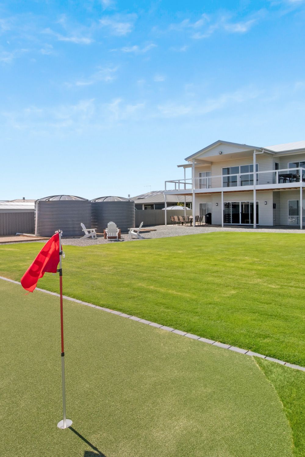 The property is a 2-story, 5 bedroom home with fantastic water and sunset views from the balcony, and a large garden featuring a putting green, a fire pit and bbq facilites.