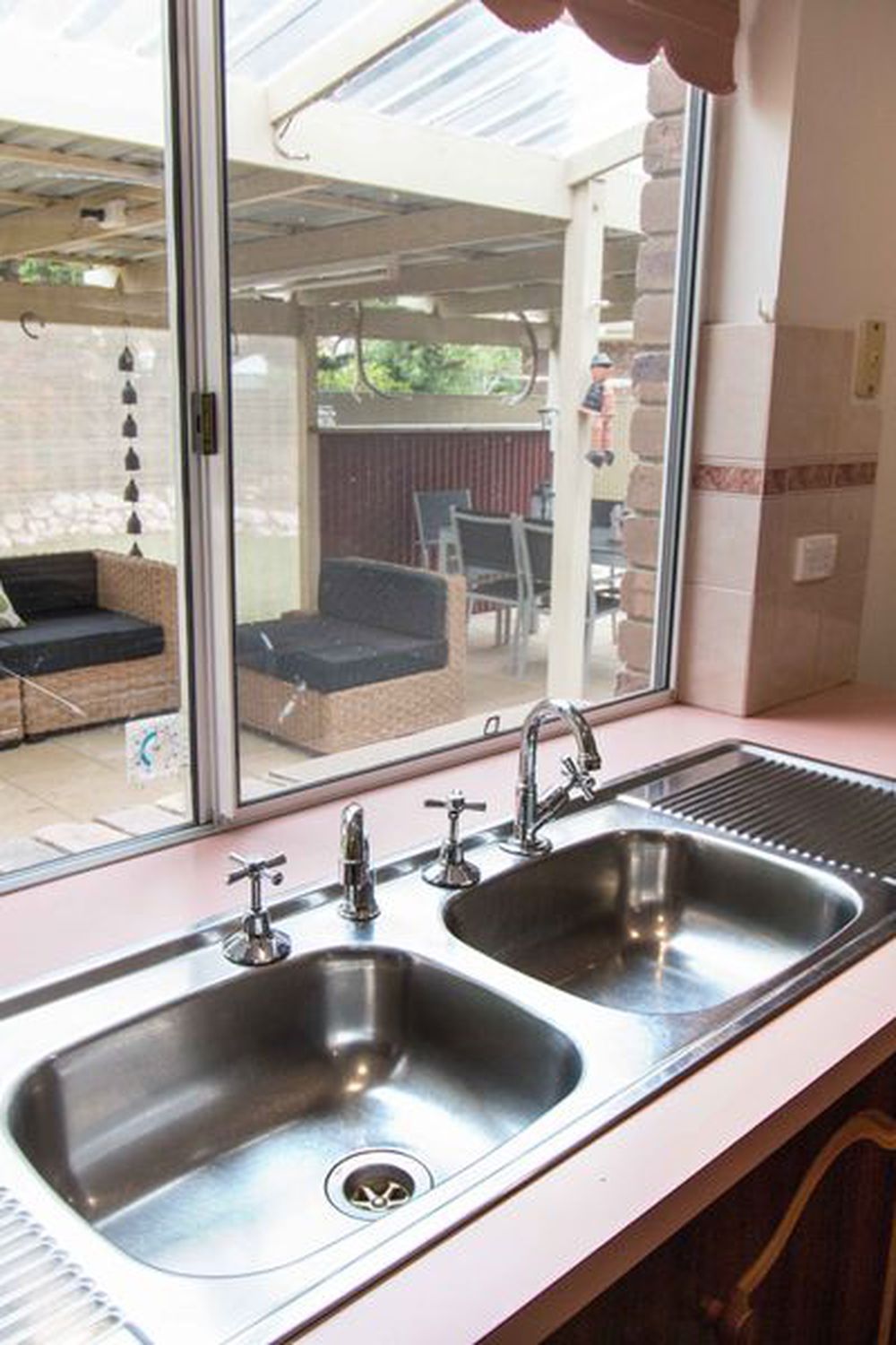 Expanding the width of the home is the large living space, currently used as a family and formal dining. A separate living space or sitting room is adjacent the kitchen, in the centre of the home.