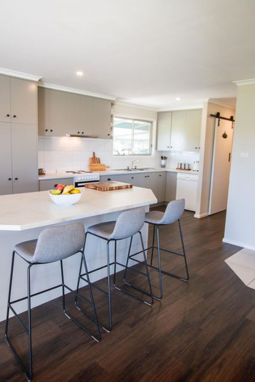 The kitchen has been refreshed in modern greys and white and is the central part of this open plan living home. Loads of cupboard space in the kitchen is complemented by a ‘mud room’ or laundry located off the kitchen. A brand new oven was installed recently and the hot water service is less than 12 months old.