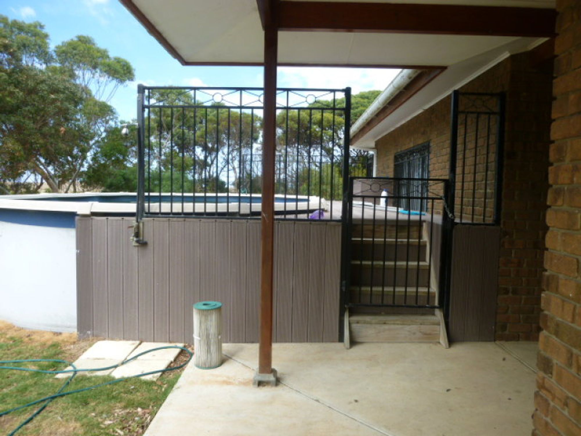 On the eastern side of the house is an above ground salt chlorinated pool with a pump that can be set to a timer.
