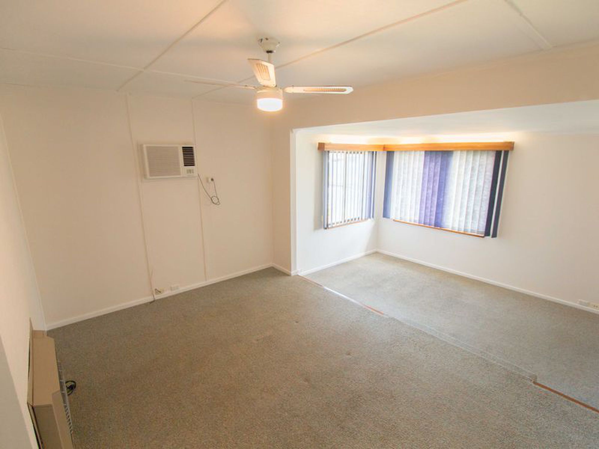 The split level lounge has a ceiling fan, wall mounted reverse cycle air con and gas heater.