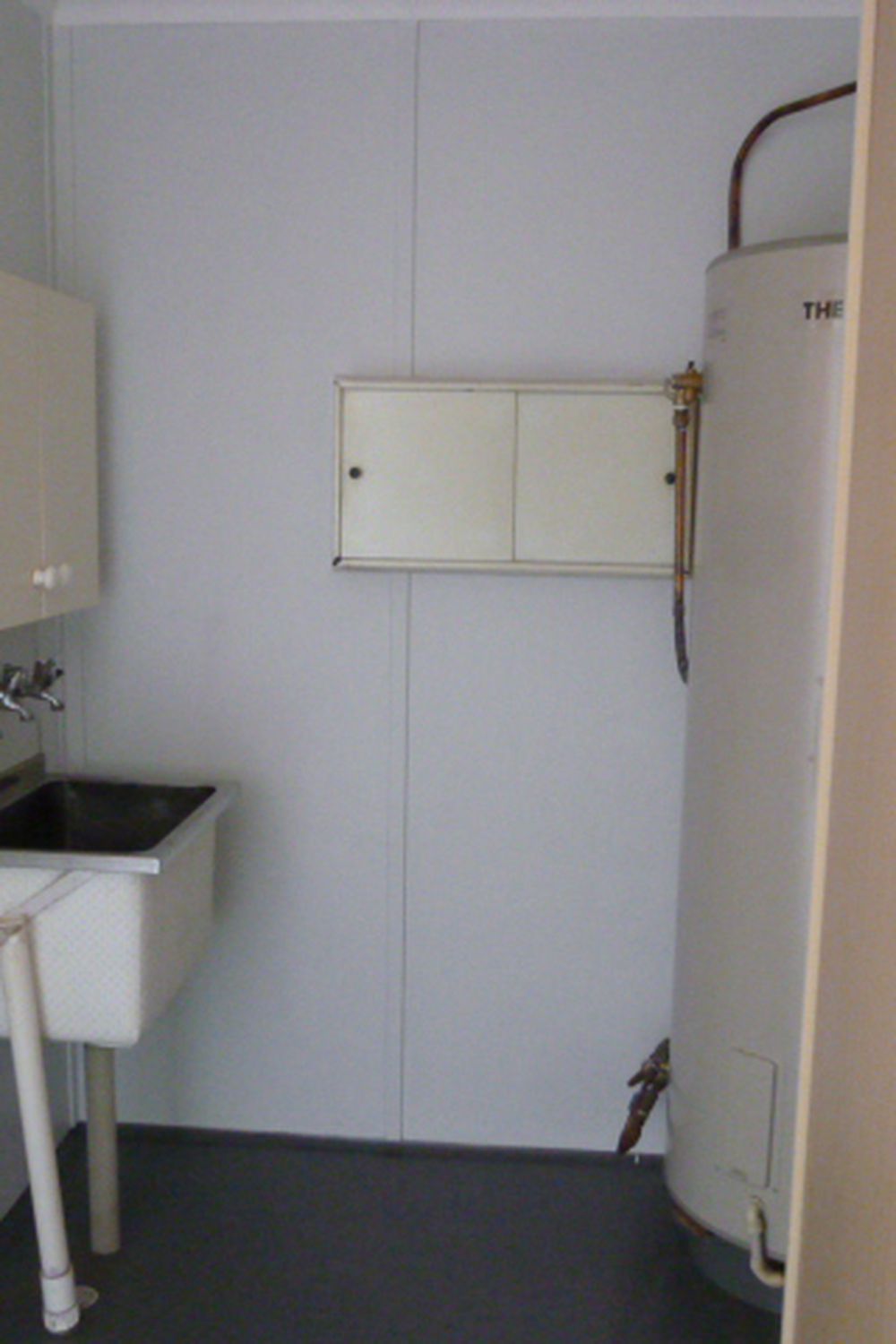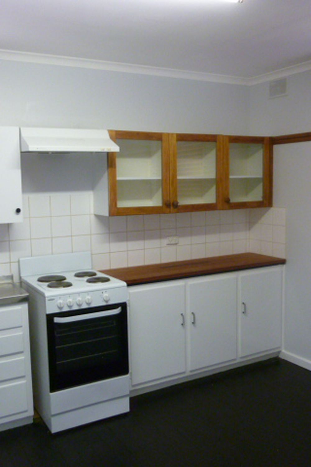 The kitchen/dining room is 1950's style with timber bench tops, stained timber floor and electric stove.