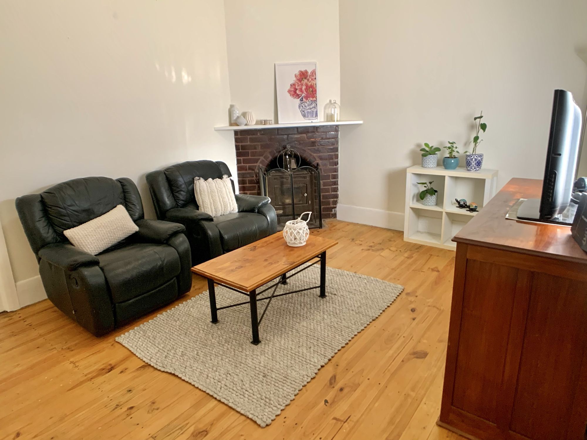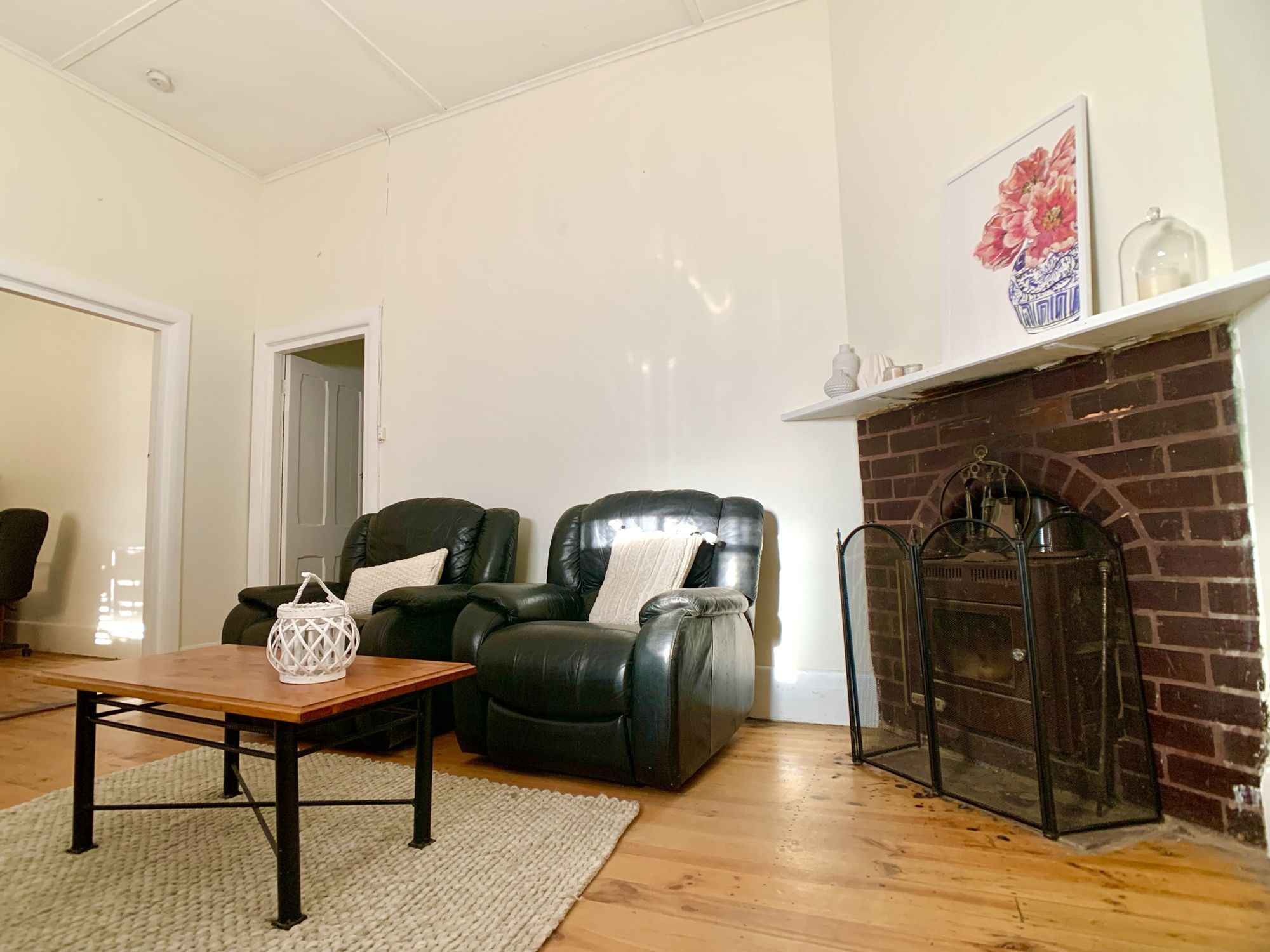 The lounge, with timber floors is cosy with a slow combustion fire and reverse cycle wall unit.