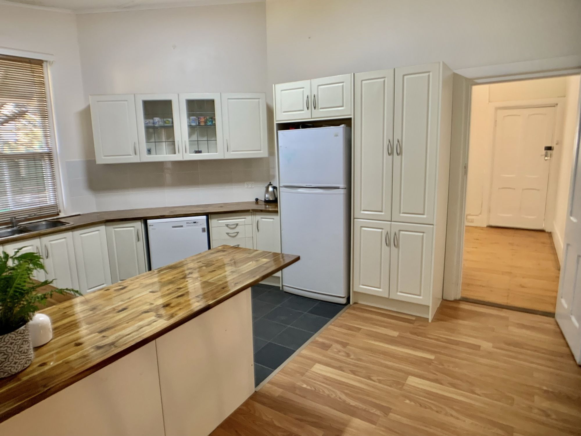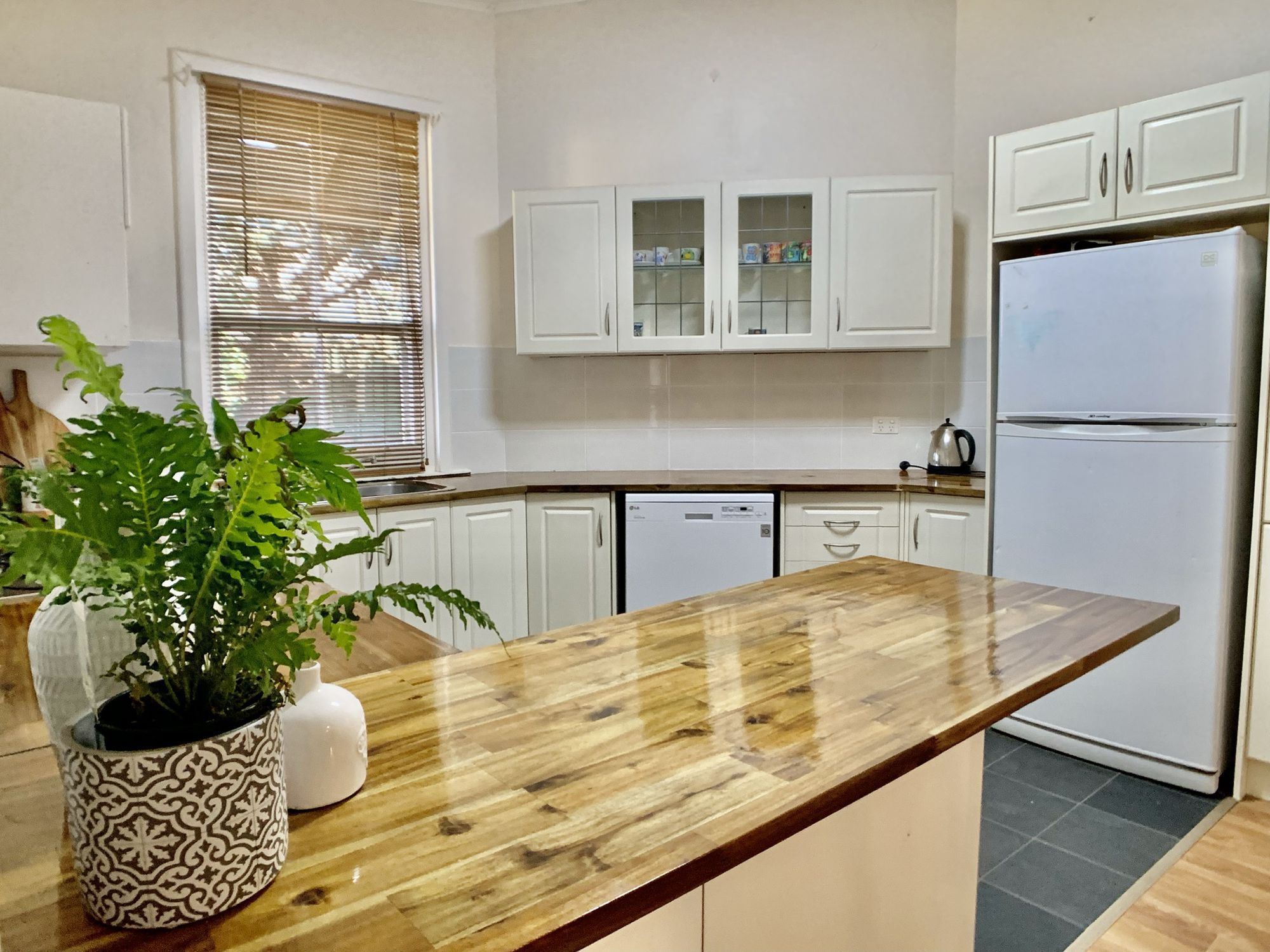 The kitchen is in the heart of the home and has been fully renovated to include timber bench tops with breakfast bar, dishwasher, under bench oven with gas cooktop and ample cupboard space.