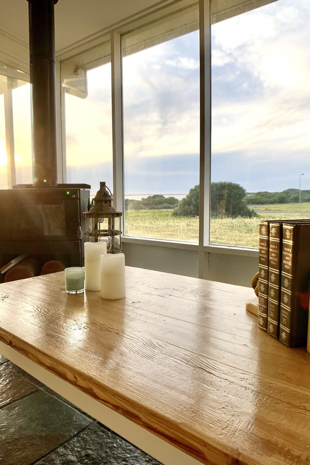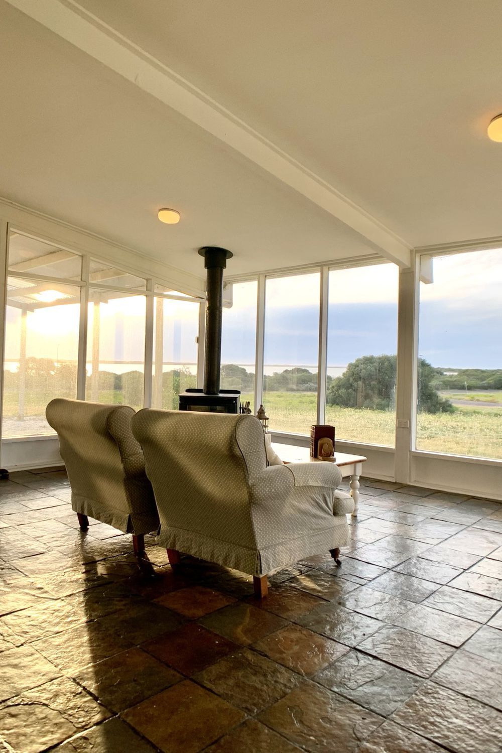 Across the water are the commanding sand dunes of the Younghusband Peninsula. The North-West facing home captures every sunset from the sunken living area with slate floor and slow combustion fireplace.