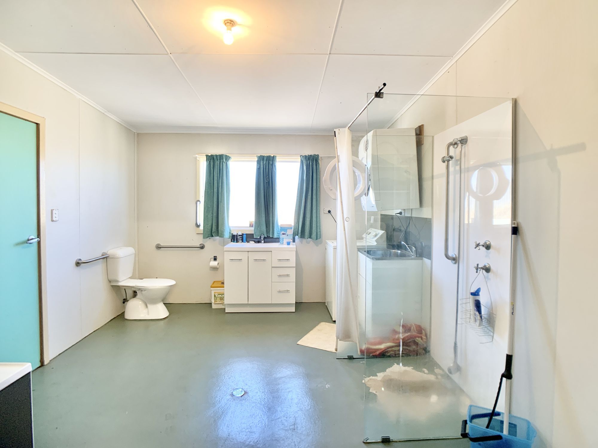 The 30x12m shed with five 4m high sliding doors has single phase power and concrete floor. Two workshop areas, mezzanines, and wash area with hot and cold water.